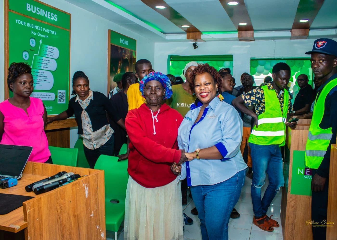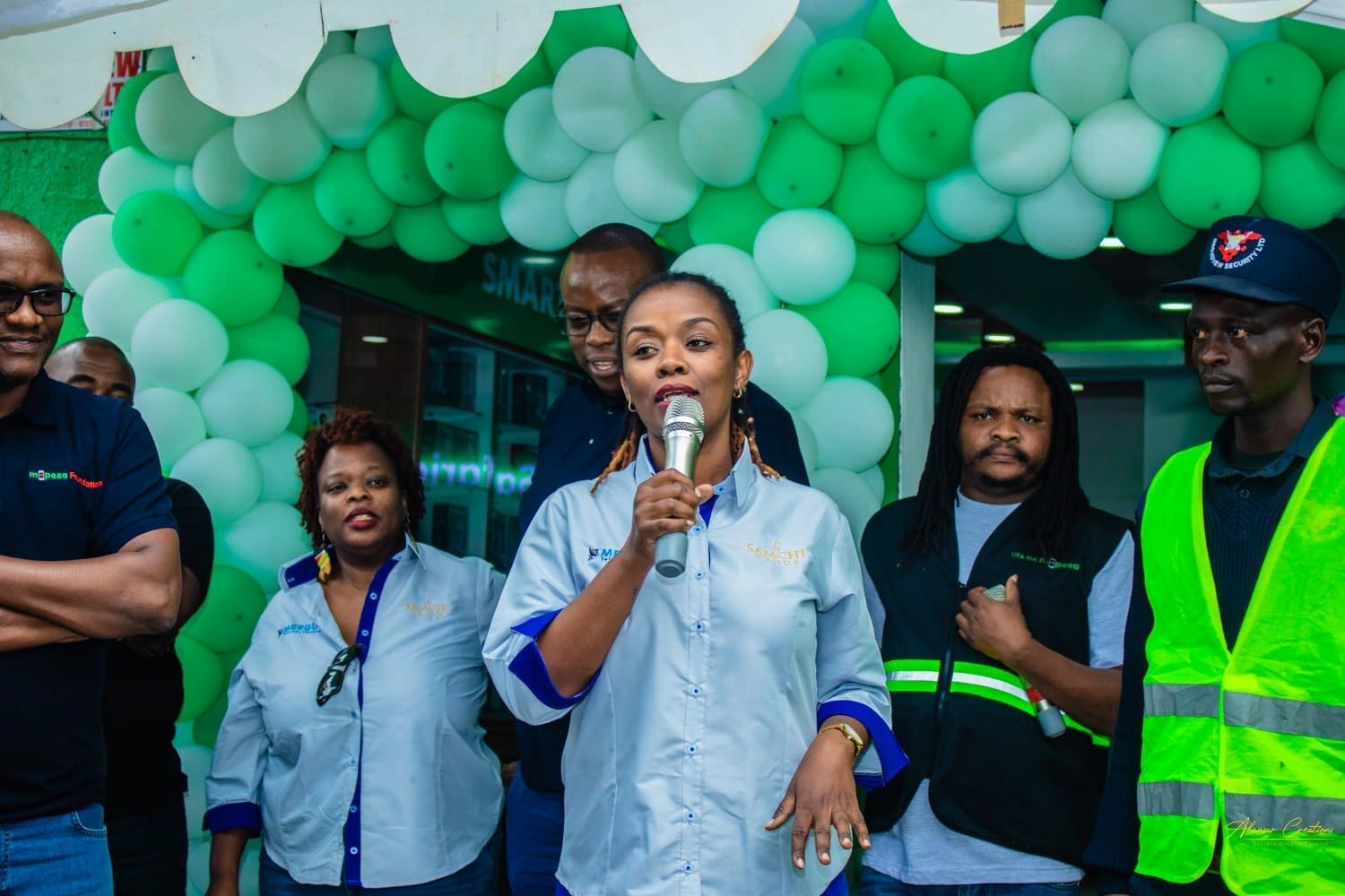Here’s Samchi Telecom staff during the reopening of their Timau branch in Limuru, Kenya