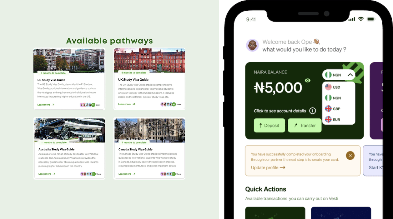 Pathways by Vesti - a software roadmap for migrants (left), and the Vesti multi-currency wallet.