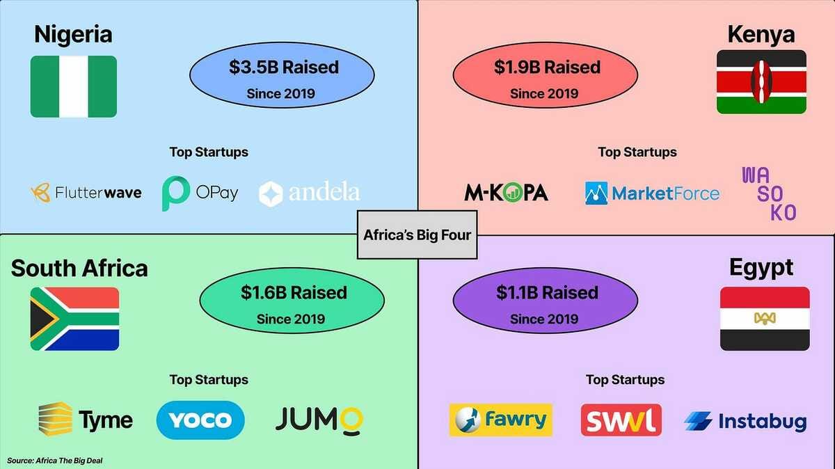 Nigeria is the central ecosystem for startups in West Africa, Kenya in East Africa, Egypt in MENA (Middle East/North Africa) and South Africa in.. South Africa.