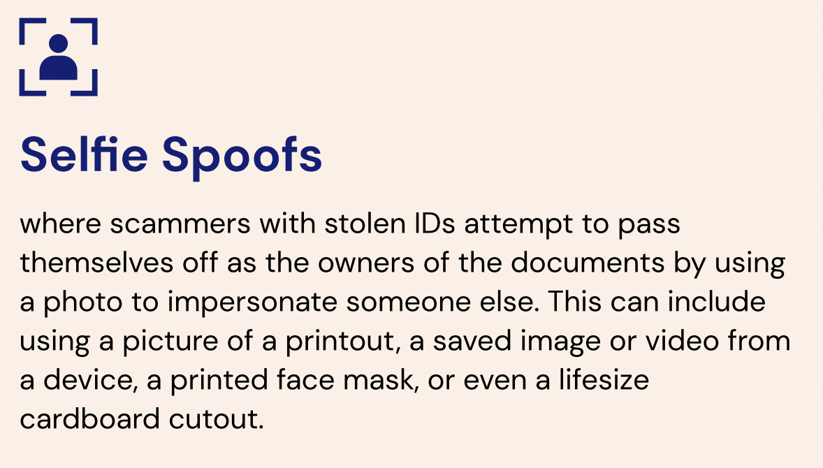 Also known as a selfie or facial spoofing, scammers with stolen IDs use a person’s face to outsmart facial recognition systems.