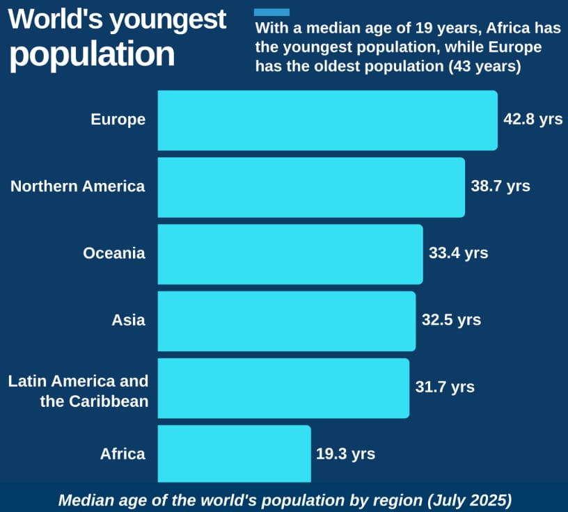 The median age in Europe is 43. In Asia, it’s 33. In North America, it’s 39.