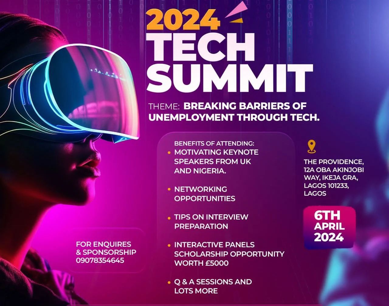 Calling all techies in Lagos! The Lagos Tech Summit 2024 takes place on the 6th of April, 2024. The Summit aims to tackle unemployment by leveraging the power of technology with the theme “Breaking Barriers of Unemployment through Tech.” Get your tickets here.