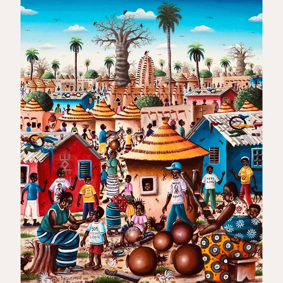 This is the work of Djiguemde Roger, a Burkinabe artist who shows the rich and complex everyday of Burkinabes