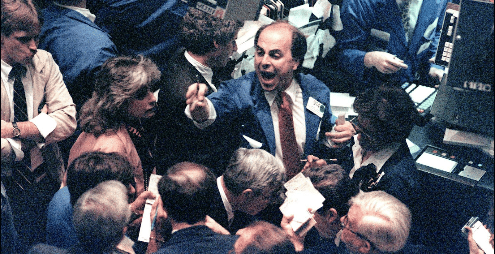 This is the New York Stock Exchange in the 1980s. Before computers took over, people used to buy and sell stocks by screaming prices on a trading floor just like this.